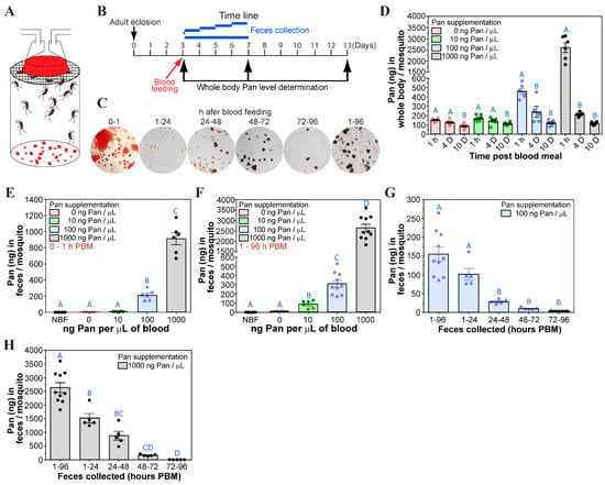 Pan levels in bodies and feces of A. stephensi supplemented with Pan in blood. (A). A schematic showing female mosquitoes taking a blood meal supplemented with Pan. Females were allowed to feed on warmed blood (40 °C) for 1 h through parafilm. (B). A schematic showing the timeline for Pan quantification in mosquito bodies and in feces following feeding. (C). Representative images of feces collected after blood feeding. Images of mosquito feces following feeding on unsupplemented blood. Feces from unsupplemented and supplemented mosquitoes were not visibly different. (D). Whole body Pan levels from mosquitoes fed on 0, 10, 100, or 1000 ng/µL Pan in blood. Pan quantification was performed on pools of 5 whole bodies at 1 h, 4 d, and 10 d PBM using the Lactobacillus plantarum assay. Feces were collected over the first hour (E) and from 1–96 h (F) PBM, dissolved in acetate buffer, and used to quantify excreted Pan. (G). Pan levels in feces from mosquitoes fed on Pan supplemented blood (100 ng/µL) and collected between 1 and 24 h, 24 and 48 h, 48 and 72 h, 72 and 96 h, and 1 and 96 h after blood feeding. (H). Pan levels in feces from mosquitoes fed on Pan supplemented blood (1000 ng/µL). Feces were collected between 1 and 24 h, 24 and 48 h, 48 and 72 h, 72 and 96 h, and 1 to 96 h PBM. Each dot represents individual samples and bars represent the mean and standard error. Different letters indicate statistically significant differences (one-way ANOVA and Tukey’s post hoc, N = 6–10).
