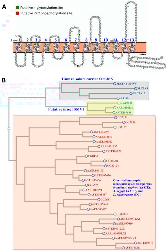 Predicted tertiary structure and phylogenetic tree of putative sodium-dependent multivitamin transporters (SMVTs). (A) Schematic representation of the predicted intracellular, extracellular, and transmembrane domains, as well as putative n-glycosylation and PKC phosphorylation sites in A. stephensi SMVT. Intracellular, extracellular, and alpha-helical transmembrane domains were detected by TMHMM 2.0 (https://services.healthtech.dtu.dk/services/TMHMM-2.0/, accessed on 12 October 2024). (B). A phylogenetic tree of human, mosquito, and fruit fly sodium-coupled monocarboxylate transporters. Multiple sequence alignment and phylogenetic tree construction were performed using CLUSTALW at GenomeNet (https://www.genome.jp/tools-bin/clustalw, accessed on 12 October 2024).