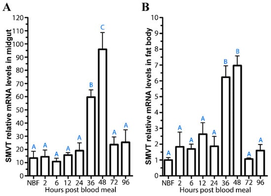 AsteSMVT transcript expression in the midgut (A) and fat body (B) throughout a reproductive cycle. qPCR was used to detect AsteSMVT transcript expression prior to blood feeding (NBF) and at various timepoints following a blood meal (2–96 h). Different letters indicate statistically significant differences (one-way ANOVA and Tukey’s post hoc).