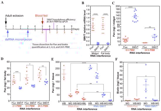 Impact of AsteSMVT RNAi knockdown on midgut and body Pan and biotin levels. (A). Schematic of RNAi knockdown protocol showing the timing of dsRNA microinjection, blood feeding, and tissue dissection for Pan and biotin determination. (B). Efficiency of AsteSMVT transcript knockdown as quantified by qPCR. (C). Pan levels were determined from dissected fat body at 2, 6, and 24 h PBM. Each dot represents fat bodies pooled from five RNAi treated mosquitoes (N = 30) and bars represent the mean and standard error. (D). Pan levels were determined from dissected midgut at 6 and 24 h PBM. Each dot contains midguts pooled from ten RNAi treated mosquitoes (N = 60–120). (E). Pan levels were determined from whole body (WB) and dissected midgut (MG), carcass (whole body minus midgut, WB–MG), and hemolymph (HML) at 4 h PBM (N = 15–30). (F). Biotin levels were determined using dissected midguts (MG) and carcasses (whole body minus midgut, WB–MG) at 4 h PBM (N = 25). Significant differences were determined using the unpaired Student’s t-test (* p < 0.05, ** p < 0.01, *** p < 0.001, and **** p < 0.0001).