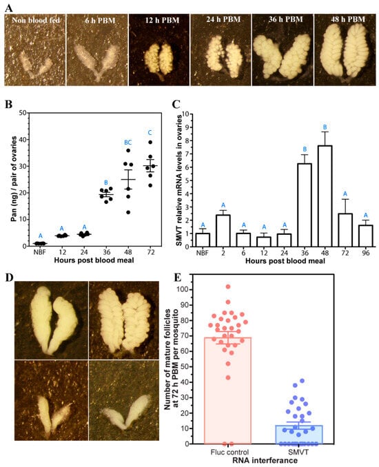 Pan and AsteSMVT transcript levels in A. stephensi ovaries during follicle development. (A). Ovaries prior to blood feeding (NBF) and at 6, 12, 24, 36, and 48 h PBM. All ovaries were imaged at an identical magnification (20×) (B). Pan levels were measured by Lactobacillus plantarum microbiological assay in ovaries dissected from NBF mosquitoes and mosquitoes at 12, 24, 36, and 48 h PBM. Each dot represents 10 pairs of ovaries and bars represent the mean and standard error. Different letters indicate significant differences (one-way ANOVA, N = 6). (C). Relative AsteSMVT mRNA expression in ovaries during development. qPCR was performed on three separate cohorts of mosquitoes using AsteSMVT gene-specific primers and normalized to ribosomal protein S7 (AsteRPS7). Both AsteSMVT and AsteRPS7 showed a single peak in their respective melting curves. Relative levels were calculated by normalizing to NBF. Different letters indicate significantly different expression levels (p < 0.05). (D). Knockdown of AsteSMVT led to a significant decrease in the number of fully developed follicles at 72 h PBM. Upper photos are representative ovaries from controls injected with dsFluc and bottom photos are representative of ovaries from AsteSMVT knockdown mosquitoes. All ovaries were imaged at an identical magnification (20×) (E). Number of developed follicles at 72 h in females injected with dsFluc or dsAsteSMVT (n = 30; p < 0.001).