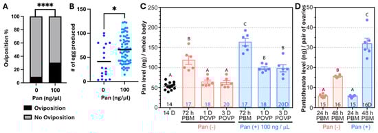 Impact of Pan supplementation on reproduction in 14 d old A. stephensi. (A). Percentage of 14 d old mosquitoes ovipositing when the blood meal was supplemented with 100 ng/µL Pan or without Pan (n = 195 control females, n = 261 Pan-treated females from four biological replicates; **** p < 0.0001). (B). Number of eggs laid per ovipositing female (n = 18 control females, n = 70 Pan-treated females from four biological replicates; * p < 0.05). Pan levels in the whole bodies (C) and ovaries (D) of 14 d old female mosquitoes provisioned with Pan. Each dot represents a pool of 5 mosquitoes and bars represent the mean and standard error. The age of mosquitoes or time post-oviposition (POVP) when the sample was collected is indicated at the bottom of each bar. Different letters indicate statistically significant differences (one-way ANOVA and Tukey’s post hoc).