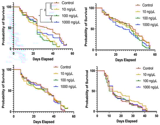 Pan supplementation via blood meal did not impact adult female A. stephensi survival. Survival curves from four separate cohorts showing the daily probability of survival for adult females supplemented with 0, 10, 100 or 1000 ng/µL Pan via blood meal. Dead mosquitoes were counted and removed daily (n = 1443 females across all replicates, n ≈ 100 females per treatment per replicate); * p < 0.05, ** p < 0.01, **** p < 0.0001). Kaplan–Meier survival analysis was used to test the variation in survival distribution of mosquitoes in each cohort while Log-rank test was used to compare each treatment group with the control.