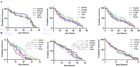 Pan supplementation via water-soaked cotton pads did not impact adult A. stephensi survival. Survival curves showing the daily probability of survival for females (A) and males (B) supplemented with 0, 0.05, 0.5, 5 or 50 g/L Pan via water-soaked cotton balls. Cotton balls were replaced daily, and dead mosquitoes were counted and removed daily (n = 40 males and females per group in replicate 1, n = 80 males and females per group in replicates 2 and 3; * p < 0.05, ** p < 0.01, *** p < 0.001). Kaplan–Meier survival analysis was used to test the variation in survival distribution of mosquitoes in each cohort while Log-rank test was used to compare each treatment group with the control.