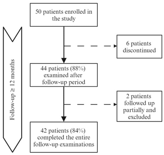 Among 50 recruited people with PMS, 6 patients withdrew from this study during the follow-up period due to personal reasons, which resulted in 44 patients (88%) being examined at the second time point (after ≥ 12 months), 2 of whom completed follow-up examinations only partially. Eventually, 42 patients who completed the entire follow-up procedure were included in the statistical analysis (see flowchart in Figure 1). Participants in this study were assigned into two groups according to PMS subtype (23 PPMS and 19 SPMS patients). Baseline characteristics of the study group are presented in Table 1. The type of disease-modifying therapy (DMT) applied at the time of recruitment and during follow-up was stratified according to the system commonly used for RRMS into moderate-efficacy (MET; teriflunomide, dimethyl fumarate, interferon-beta and glatiramer acetate) or high-efficacy DMT (HET; ocrelizumab and natalizumab) [] (see Table 2 and Table S1 in the Supplementary Materials). However, it has to be emphasized at this point that the influence of DMTs on disease progression in MS is much lower than in the case of inflammatory activity, and only a few DMTs have been officially registered for use in progressive disease. During the observation period, no escalation of DMT was implemented and two patients discontinued DMT due to adverse events. Ten patients were enrolled in this study at the moment of starting DMT (pertains to ocrelizumab). During this study, three disease relapses were reported.
