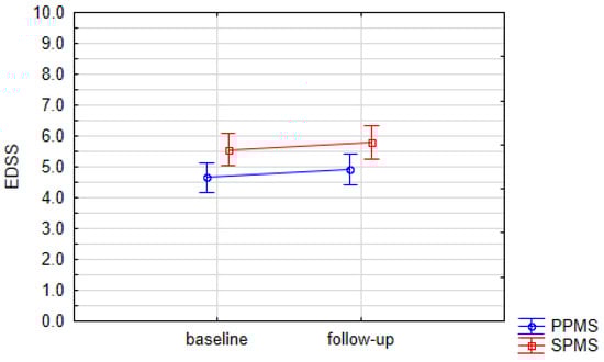 Changes in mean EDSS during study period. Data presented as means (points) with SE (whiskers). Values did not reach statistical significance. EDSS—Expanded Disability Status Scale, PPMS—primary progressive multiple sclerosis, SPMS—secondary progressive multiple sclerosis.