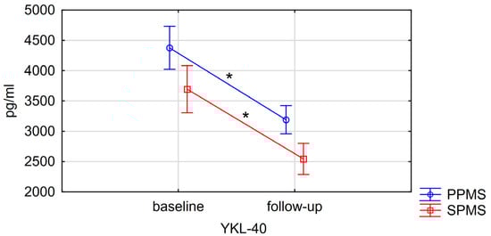 Changes in serum YKL-40 levels. Data presented as means with standard error (SE). “*” statistical significance p < 0.05. Figure S1A,B regarding changes in serum levels of NfL and CXCL-13, respectively, are included in Supplementary Materials. PPMS—primary progressive multiple sclerosis, SPMS—secondary progressive multiple sclerosis, NfL—neurofilament light chain, CXCL-13—C-X-C Motif Chemokine Ligand 13, YKL-40—chitanse-3 like-protein-1.