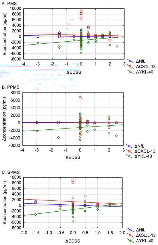 (A–C): Correlations between EDSS and serum biomarkers change. Values did not reach statistical significance. (A) PMS; (B) PPMS and (C) SPMS. EDSS—Expanded Disability Status Scale, PMS—progressive multiple sclerosis, PPMS—primary progressive multiple sclerosis, SPMS—secondary progressive multiple sclerosis, NfL—neurofilament light chain, CXCL-13—C-X-C Motif Chemokine Ligand 13, YKL-40—chitanse-3 like-protein-1.