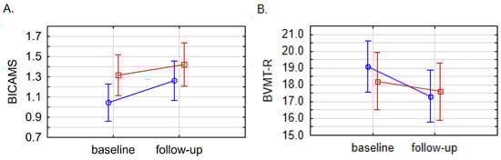 Cognitive function assessment at baseline and after follow-up. PMS—progressive multiple sclerosis, PPMS—primary progressive multiple sclerosis, SPMS—secondary progressive multiple sclerosis, BICAMS—Brief International Cognitive Assessment for Multiple Sclerosis, BVMT-R—Brief Visuospatial Memory Test Revised, CVLT—California Verbal Learning Test, SDMT—Symbol Digit Modalities Test, VFT letter ‘k’—Verbal Fluency Test phonological version, VFT animals—Verbal Fluency Test semantic version, SCWT-A—Stroop Color and Word Test part A, SCWT-B—Stroop Color and Word Test part B. a indicates comparison between study time points calculated with t-test; b indicates comparison between groups and study time points calculated with generalized linear model.