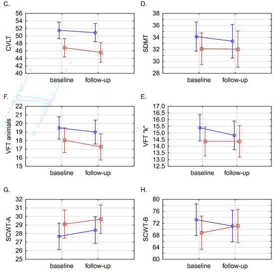 Generalized linear model with repeated measures for BICAMS (A), BVMT-R (B), CVLT (C), SDMT (D), VFT (E,F), and SCWT (G,H). Data presented as means with standard error (SE). Values did not reach statistical significance. As previously, blue indicates PPMS group and red indicates SPMS group. PPMS—primary progressive multiple sclerosis, SPMS—secondary progressive multiple sclerosis.