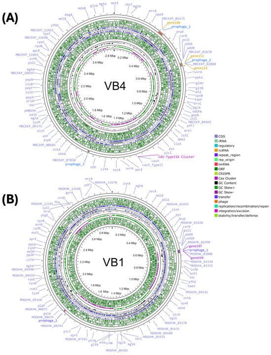 Circular graphical representations of the Lacticaseibacillus rhamnosus strains VB4 (A) and VB1 (B) contigs obtained using Proksee (https://proksee.ca; accessed on 13 January 2024). The black central circle shows the scale expressed in megabases. Moving inward, the two outer violet circles show forward- and reverse-strand CDSs, respectively. Some genes are shown on the outer violet circle with the Proksee’s default. In CDSs circles, tRNAs are shown as orange arrows, rRNAs are represented as light blue arrows, tmRNA is displayed as a red arrow, and CRISPR sequences are reported as light green arrows adjacent to each other. The next circle shows the GC content and GC skew as dark blue and dark green and pink, respectively. The represented genomic order of contigs is arbitrary.