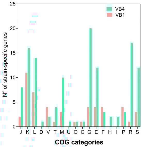 The functional analysis of strain-specific genes pointed out that three main COG categories were abundant in VB4 strain-specific genes, namely carbohydrates metabolism and transport (20), amino acid transport and metabolism (12), and cell wall/membrane/envelope biogenesis (10), but poorly represented in VB1 genome. In VB1 genome strain-specific genes mainly belonged to the categories of transcription (11) and replication, recombination, and repair (7) (Figure 4).