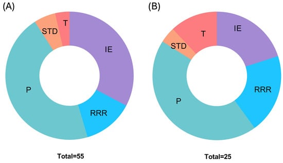 Distribution of mobile genetic elements in Lacticaseibacillus rhamnosus VB4 (A) and VB1 (B) genomes. Major categories considered were IE, integration/excision; RRR, replication/recombination/repair; P, phage; STD, stability/transfer/defense; and T, transfer.