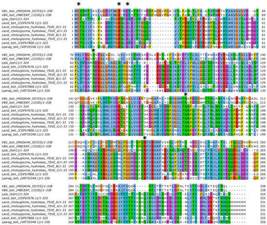 Multiple amino acid sequence alignment of 10 BSHs proteins selected from Supplementary Table S1. Asterisks indicate active sites, according to [10].
