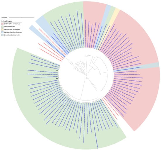 The amino acid sequences of the previously characterized bsh genes were used as queries to search bsh gene candidates in genome sequences of strains VB4 and VB1 through the BLASTp tool (https://blast.ncbi.nlm.nih.gov/Blast.cgi, 2 February 2024) (Supplementary Table S2). Candidate bsh genes in VB4 and VB1 genomes were then aligned using the Constraint-Based Alignment Tool (COBALT) [49] with 88 Refseq amino acid sequences annotated as bsh or putative bsh proteins from lactobacilli species and 6 amino acid sequences annotated as PVA proteins and chosen according to O’Flaherty et al. [17] and Daly et al. [50]. When required, sequence alignments were visualized with Jalview v2.11.4.0 [51]. A phylogenetic tree was constructed with the Fast Minimum evolution tree method [52]. The evolutionary distance between sequences was modeled according to Grishin [53] with the maximum allowed fraction of mismatched bases set up to 0.85. The resulting tree was visualized with iTOL [39].