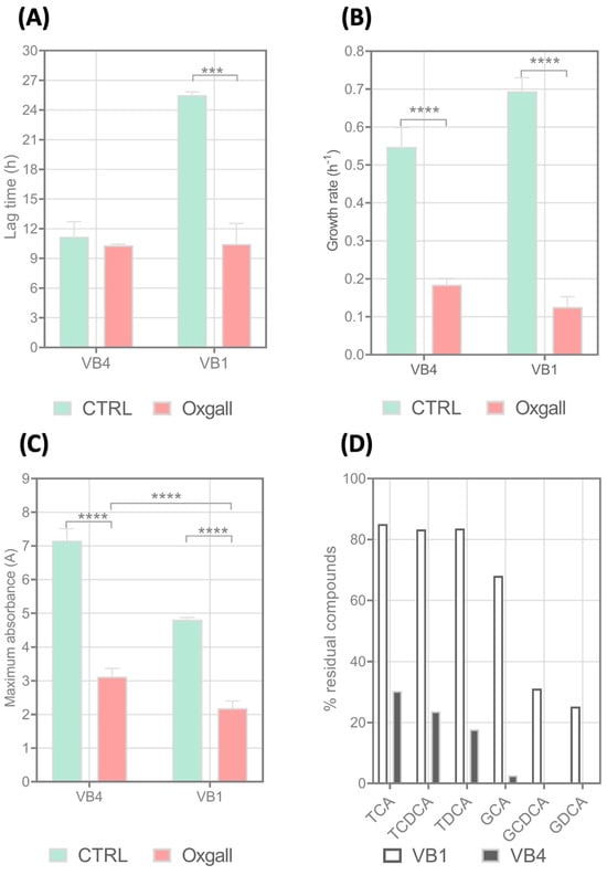 Growth and deconjugation ability of Lacticaseibacillus rhamnosus VB4 and VB1 strains in the presence of a BAs mixture (Oxgall). Kinetic parameters lag phase (λ, expressed in h) (A), maximum growth rate (µ, expressed as h−1) (B), and maximum cell density (A, expressed as OD600 nm) (C) were computed in MRS and MRS supplemented with BAs 1% (w/v) by Grofit package (version 1.1.1-1). Residual unconjugated percentages (%) of GCA, GDCA, GCDCA, TCA, TDCA, and TCDCA were estimated in supernatants collected during late stationary phase (D). Significant differences were calculated with two-way ANOVA and indicated with asterisks, as follows: ***, p ≤ 0.001; ****, p ≤ 0.0001 (two-way ANOVA). Plotted with GraphPad Prism v.8.00 software (San Diego, CA, USA). Abbreviations: GCA, glycocholic acid; GDCA, glycodeoxycholic acid; GCDCA, glyco-cheno-deoxycholic acid; TCA, taurocholic acid; TDCA, taurodeoxycholic acid; and TCDCA, tauro-cheno-deoxycholic acid.