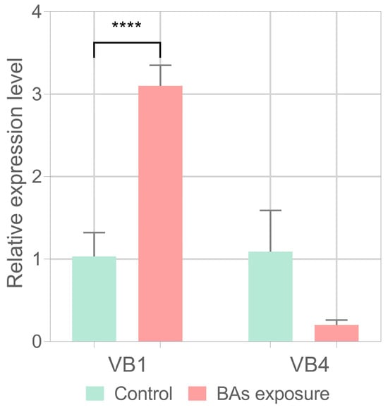 Expression profile of bsh genes in Lacticaseibacillus rhamnosus VB4 and VB1 in MRS (control condition) and MRS supplemented with 1% (w/v) BAs mixture. Significant differences were calculated with a Student’s t-test and indicated with asterisks, as follow: ****, p ≤ 0.0001. The bar graph was plotted with GraphPad Prism v.8.00 software (San Diego, CA, USA).