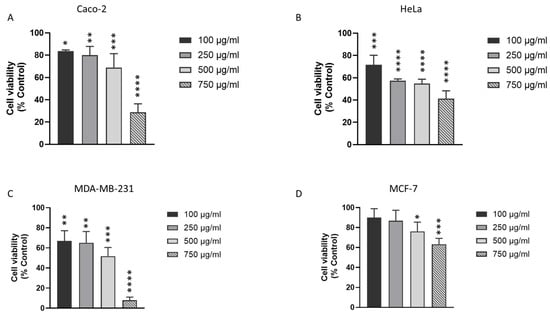 Effect of DM Soxhlet extract on the viability of different solid cancer cell lines. MTT assay was used to assess the viability of Caco-2 colon cancer cells, MCF-7 and MDA-MB-231 breast cancer cells, as well as HeLa cervical cancer cells after 24 h of treatment with various concentrations of the DM Soxhlet extract (0-100-250-500-750 µg/mL). (A) Caco-2, (B) HeLa, (C) MDA-MB-231, and (D) MCF-7 cells treated with DM Soxhlet extract for 24 h. The percentage of cell viability was calculated considering the value of the control as 100%. Results are presented as the mean ± SD (n ≥ 3). * p < 0.05, ** p < 0.01, *** p < 0.001, **** p < 0.0001 vs. control group. DM: Dichloromethane/Methanol.
