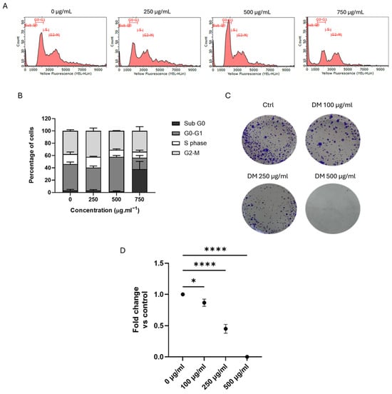 To investigate the molecular pathways underlying the anticancer effects of DM extract, we used HCT-116 colon cancer cells as a model system for detailed analysis. To investigate the cytotoxic mechanism of DM Soxhlet on HCT-116 cells, we performed cell cycle analysis on HCT-116 cells using flow cytometry (Figure 2). DM Soxhlet extract induced significant changes in the cell cycle of HCT-116 cells. Untreated cells presented a typical cytogram of a diploid cell population. Treated cells with 500 μg/mL of DM Soxhlet extract for 24 h demonstrated a significant accumulation in the G0–G1 phase, increasing by 43.7% compared to 32.66% for the control. Moreover, the number of cells in the sub-G0 phase increased considerably upon treatment with 750 μg/mL, reaching 29.78% compared to 2.58% in control (Figure 2A,B). This notable increase in the sub-G0 phase strongly suggests an induction of apoptosis, as deregulation of the cell cycle is closely associated with programmed cell death.
