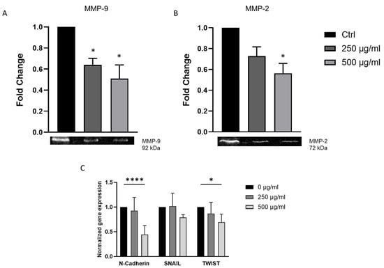 Analysis of EMT markers expression and matrix metalloproteinase activity in HCT-116 cells after exposure to J. rubens DM Soxhlet extract. (A,B) Gelatin zymography analysis of HCT-116 cells treated with 250 and 500 μg/mL DM extract for 24 h. Proteins were resolved on a gelatin-containing polyacrylamide gel to evaluate MMP-9 and MMP-2 enzymatic activity. The bar graph shows the densitometric quantification of zymographic bands. Data represents results from two independent experiments. * p < 0.05. (C) mRNA expression levels of EMT-related genes (N-cadherin, TWIST, and SNAIL) in HCT-116 cells treated with 250 and 500 μg/mL DM extract for 16 h. Gene expression was quantified by qRT-PCR, normalized to GAPDH, and presented relative to untreated control cells. Bar graphs represent the mean ± SD from three to five independent experiments. * p < 0.05, **** p < 0.0001.