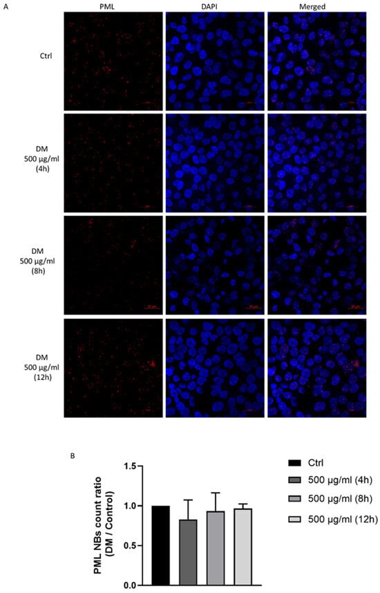Promyelocytic leukemia nuclear bodies (PML-NBs) are nuclear structures associated with transcriptional regulation, viral infection response, genomic stability, apoptosis induction, and tumor suppression. Promyelocytic leukemia protein (PML) has been identified as a sensor of ROS, responding to oxidative stress by activating p53 and promoting Nrf2-dependent antioxidant responses [40,41]. To explore PML-NBs biogenesis in response to DM extract, we treated HCT-116 with 500 μg/mL for four hours, eight hours, and 12 h. No evident changes were detected in the number, size, or distribution of PML- NBs at any of the tested time points following DM extract treatment compared to the untreated control group (Figure 6). This indicates that J. rubens DM ROS production does not trigger PML-associated stress responses.