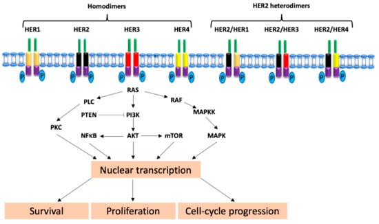 - Coussens, L.; Yang-Feng, T.L.; Liao, Y.C.; Chen, E.; Gray, A.; McGrath, J.; Seeburg, P.H.; Libermann, T.A.; Schlessinger, J.; Francke, U.; et al. Tyrosine kinase receptor with extensive homology to EGF receptor shares chromosomal location with neu oncogene. Science 1985, 230, 1132–1139. [Google Scholar] [CrossRef]