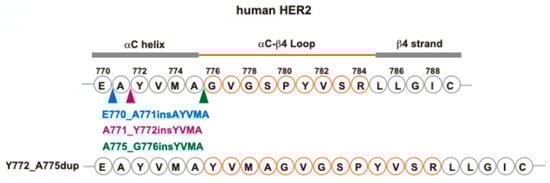 Sequence alignment of ERBB2 Y772_A775dup. Residues in the αC-β4 loop are shown in orange circles.