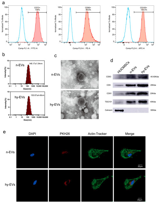 Extraction and identification of HUCMSCs and their EVs. (a) Identification of HUCMSCs markers CD73, CD90, and CD105 by flow cytometry. (b) NTA measurement of n-EVs and hy-EVs. (c) Morphological features and sizes of n-EVs and hy-EVs were analyzed under TEM. (d) Western blot analysis of surface protein markers CD63, CD9, CD81, TSG101and negative marker Calnexin of EVs (original Western blot images can be found in Figure S4). (e) CLSM images of HUVECs (green) co-incubated with n-EVs (red) and hy-EVs (red) for 6 h, Nuclei were stained with DAPI (blue).