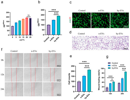 Hy-EVs enhanced the proliferation and migration of HSFs. (a) Analysis of CCK-8 results after HSFs were treated with different concentrations of hy-EVs for 24 h (n = 3 per group). (b) Analysis of CCK-8 results of HSFs after different treatments in each group for 24 h (n = 3 per group). (c) Live–dead cell staining of HSFs after different treatments in each group for 24 h (n = 3 per group). (d) Transwell assay to analyze the migration of HSFs among different groups after different treatments for 24 h and (e) quantitative analysis of cell migration (n = 3 per group). (f) Scratch assay to analyze the healing of HSFs among different groups after different treatments for 12 h and 24 h and (g) quantitative analysis of the healing rate of the scratch assay (n = 3 per group). Data are mean ± SD, ns: not significant, * p < 0.05, *** p < 0.001. All p values were obtained by one-way ANOVA.