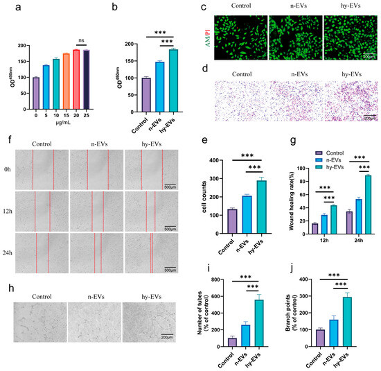Hy-EVs enhanced the proliferation, migration, and tube formation of HUVECs. (a) Analysis of CCK-8 results of HUVECs treated with different concentrations of hy-EVs for 24 h (n = 3 per group). (b) Analysis of CCK-8 results of HUVECs in each group after different treatments for 24 h (n = 3 per group). (c) Live–dead cell staining of HUVECs in each group after different treatments for 24 h (n = 3 per group). (d) Transwell assay to analyze the migration of HUVECs among groups after different treatments for 24 h and (e) quantitative analysis of cell migration (n = 3 per group). (f) Scratch assay to analyze the wound healing of HUVECs among groups after different treatments for 12 h and 24 h and (g) quantitative analysis of the wound healing rate in the scratch assay (n = 3 per group). (h) In vitro tube formation assay to analyze the tube-forming ability of vascular HUVECs in each group after different treatments and quantitative analysis of (i) number of tubes and (j) branch points (n = 3 per group). Data are mean ± SD, ns: not significant, *** p < 0.001. All p values were obtained by one-way ANOVA.