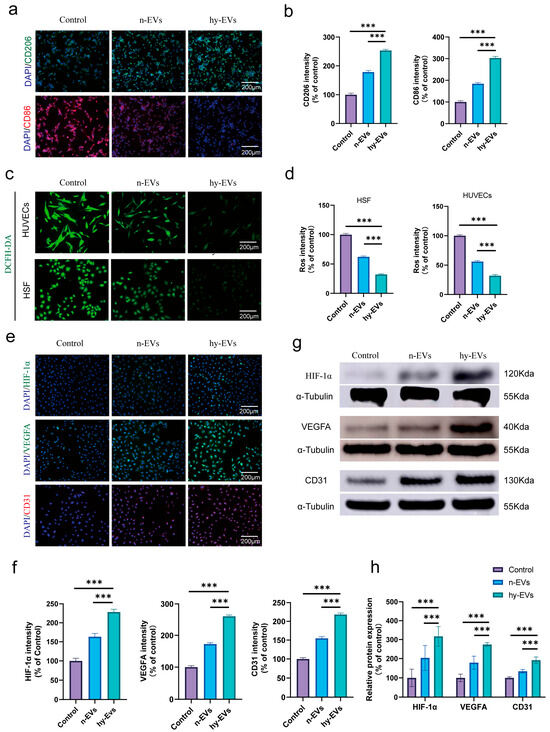Anti-inflammatory and pro-angiogenic effects of hy-EVs in vitro. (a) Immunofluorescent staining of CD86 (red) and CD206 (green) and (b) quantitative analysis of their fluorescence intensities (n = 3 per group). (c) ROS fluorescent staining of HSFs and HUVECs in different treatment groups and (d) quantitative analysis of their fluorescence intensities (n = 3 per group). (e) Immunofluorescence staining of HIF-1α (green), VEGFA (green) and CD31 (red) expression in different treatment groups, and the nuclei were stained with DAPI (blue); (f) quantitative analysis of their fluorescence intensities (n = 3 per group). (g) Western blot analysis of the expression levels of HIF-1α, VEGFA and CD31 in different treatment groups (original Western blot images can be found in Figure S4), and (h) their quantitative analysis (n = 3 per group). Data are mean ± SD, *** p < 0.001. All p values were obtained by one-way ANOVA.