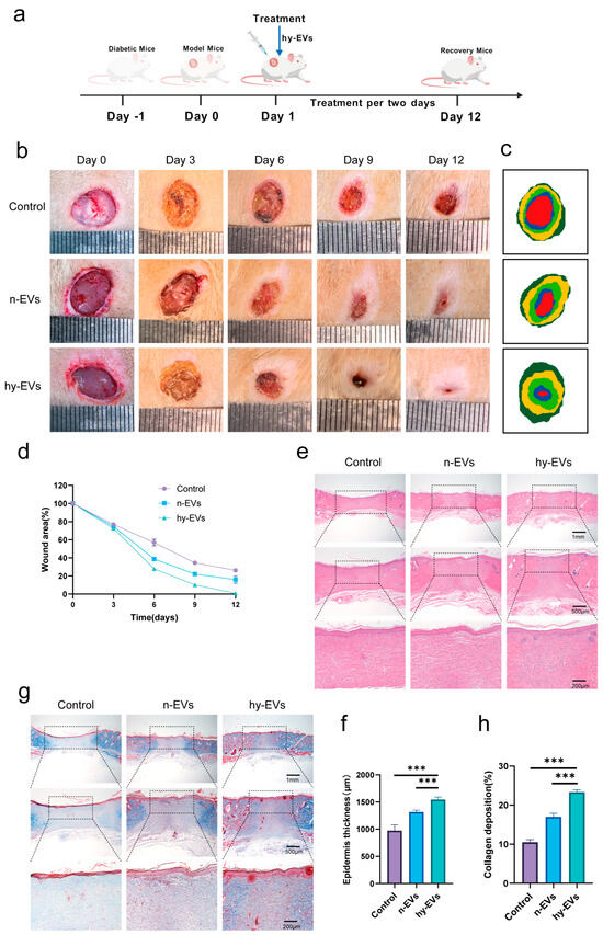 All animal-related protocols were executed following the specified guidelines established by the Animal Experiment Center of Guangxi Medical University (Approval Number: 202505004, Approval date: 17 June 2025). The experimental models consisted of Sprague-Dawley (SD) male rats, eight-week-old SD rats were housed under standard laboratory animal conditions and were acclimatized to the new environment for 1 week. Following an overnight fasting period, all rats received an intraperitoneal administration of streptozotocin (S8050, Solarbio) at 50 mg/kg to induce diabetes. Blood glucose level was measured daily until stabilized after one week. All animals with serum glucose concentrations more than 16.67 mmol/L were used in the study. A diabetic skin defect model with a diameter of approximately 10 mm was prepared on the back of rats following intraperitoneal anesthesia using 2% pentobarbital (P3761, Sigma-Aldrich, St. Louis, MO, USA) at a dose of 200 μL/kg. The rats were randomly split into three groups, which were the negative control group (100 μL PBS by subcutaneous injection, n = 6), the n-EVs group (100 μL n-EVs at 20 μg/mL by subcutaneous injection, n = 6), and the hy-EVs group (100 μL hy-EVs at 20 μg/mL by subcutaneous injection, n = 6). A digital camera monitored the advancement of wound healing at days 0, 3, 6, 9 and 12 post-injury. The wound area was quantitatively estimated at each time point using ImageJ software. Euthanasia using overdose anesthesia after completion of experiments.