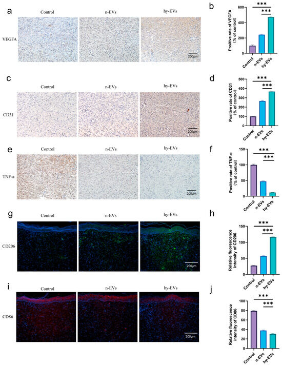 Modeling the diabetic rats was performed so that we could investigate the function of hy-EVs during wound healing. Following this, a cutaneous wound about 10 mm in diameter was inflicted on the rats’ dorsal area, and a subcutaneous injection of 100 μL of 20 μg/mL hy-EVs was performed on the wound edge every two days (Figure 6a). Wound healing was investigated with the aid of macroscopic images taken on days 0, 3, 6, 9 and 12 post-modeling. Throughout the experiment, it was observed that the hy-EVs group had the fastest rate of wound healing, while the Control group was the slowest (Figure 6b–d). Notably, treatment with n-EVs could indeed significantly promote the regenerative process of wounds in diabetes. However, compared with the hy-EVs group, the healing process was significantly delayed, which fully indicated that hy-EVs played an important role in facilitating diabetic wound healing. Histological analysis by HE staining also confirmed these findings (Figure 6e,f). On day 12, the wounds in the hy-EVs group were nearly fully healed, and new hair follicles were visible. In contrast, the control group and the n-EVs group both showed relatively limited skin thickness and hair follicle regeneration. The findings from Masson’s trichrome staining demonstrated that the hy-EVs group exhibited the most abundant collagen deposition (Figure 6g,h), indicating that hy-EVs can promote collagen deposition and consequently enhance diabetic wound healing. Additionally, we measured the expression levels of angiogenesis-associated factors like VEGFA and CD31. Immunohistochemical staining of excised tissues indicated that hy-EVs notably upregulated the expression levels of VEGFA (Figure 7a,b) and CD31 (Figure 7c,d) in vivo to promote angiogenesis in diabetic wounds. Meanwhile, we also detected the expression of the inflammatory factor TNF-α (Figure 7e,f), which was markedly decreased in the hy-EVs group, indicating that hy-EVs significantly reduced inflammation in the wound. In the hy-EVs group, we found that CD206 expression was highest (Figure 7g,h), while CD86 expression was lowest (Figure 7i,j). This suggested that hy-EVs can be used to modulate the immune response and facilitate wound healing by modulating the shift from M1 to M2 macrophage polarization. Collectively, these findings emphasized the important role of hy-EVs in enhancing diabetic wound healing.
