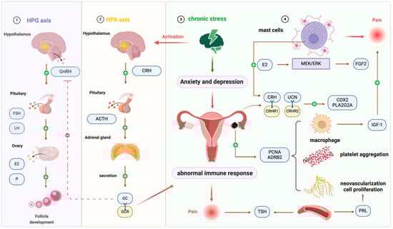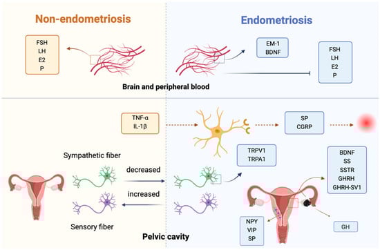 Endometriosis (EMS) is a common condition characterized by the presence of endometrial glands and stromal cells outside the uterine cavity, affecting approximately 10% of women in their reproductive age []. While the involvement of neuroendocrine and immune factors in endometriosis has been partly clarified, the underlying mechanisms are still unclear. Imbalance of the neuroendocrine–immune axis can abnormally activate hormones and cytokines, disrupt homeostasis, and promote adhesion, implantation, and invasion of ectopic endometrial tissue, leading to ectopic lesion formation. The nervous, endocrine, and immune systems do not exist in isolation; they interact to form a balance or a promoting effect during the pathophysiological process. There is a bidirectional information transmission mechanism between the neuroendocrine system and the immune system. That is, the immune system is regulated by the nervous and endocrine systems and also resizes neurological and endocrine functions. The immune system has abundant neuroendocrine hormones, synthesizing neurotransmitters and endocrine hormones. Cytokines produced by the immune system can affect the central nervous system, and the nervous system can also synthesize cytokines and their specific receptors. Women with endometriosis are often accompanied by great psychological stress, which causes neuroendocrine–immune axis imbalance, expediting disease progression and giving rise to pelvic pain and infertility, resulting in a reduction in their quality of life []. Pain in patients with EMS often worsens in a time-dependent manner, indicating the inevitability of neurological abnormalities. There are significant individual differences in pain perception, but they are weakly related to the disease stage [,]. Accordingly, minor diseases may be accompanied by severe pain, and vice versa []. Elevated stress levels in patients with EMS alter hormone secretion, emotion and behavior, sexual function, and eating habits [], resulting in an increased incidence of inflammatory complications such as inflammatory bowel disease, fibromyalgia, chronic fatigue, and even autoimmune diseases like thyroid disease, systemic lupus erythematosus, and multiple sclerosis [,]. Therefore, an in-depth analysis of the mechanisms of neuroendocrine–immune axis imbalance in EMS is requisite for illustrating the pathogenesis and delivering the theoretical and experimental basis for effective treatment strategies.