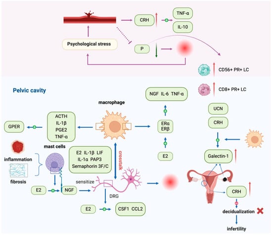 The neuroendocrine–immune axis adjusts the activity of immune cells through releasing neurotransmitters in the nervous system or alteration of endocrine activity, and the cytokines and hormone-like substances secreted by immune cells feedback on the neuroendocrine system. The bidirectional regulation between the neuroendocrine and immune system interact with each other to maintain organismal homeostasis. As an estrogen-dependent disease, EMS is mainly regulated by female reproductive hormones with disturbances in the self-stability regulation of the neuroendocrine–immune axis, resulting in elevated estrogen levels, progesterone resistance, and the concomitant abnormal expression of CRH, ACTH, and UCN []. Estrogen can promote proliferation, adhesion, angiogenesis, inflammation, and anti-apoptosis in endometrial epithelial cells (EECs) and ESCs []. Progesterone resistance produces excess E2 and overexpression of estrogen receptor β (ER-β) and promotes endometriotic invasion []. In addition, dysregulated progesterone receptor A (PR-A) and B (PR-B) ratios and impaired expression of downstream targets disrupt progesterone signaling []. Such molecular defects provide a plausible explanation for the reduced responsiveness to progestin therapy observed in patients. Clinically, randomized trials and meta-analyses have demonstrated only limited efficacy of progesterone analogs in alleviating endometriosis-associated pain, underscoring that progesterone resistance represents not only a mechanistic hallmark but also a clinically relevant therapeutic challenge []. Patients with endometriosis have higher estrogen levels in menstrual blood and peritoneal fluid than healthy women []. Estrogen plays an essential role in EMS-related pain. Estrogen-induced inflammation can stimulate and sensitize peripheral nerves, inducing pain. MCs can release nerve growth factor (NGF) under estrogen stimulation to sensitize dorsal root ganglion cells []. Estrogen mediates the interaction between macrophages and nerve fibers in EMS []. Estrogen receptors ER-a and ER-β are significantly overexpressed in macrophages of patients with EMS, and 17β-estradiol can increase the expression of ER-α on the macrophage surface and upregulate the production of IL-6 and TNF-α in LPS-activated macrophages []. Macrophages are an important source of high levels of IL-6 in the peritoneal fluid of EMS patients, and estrogen/ERα/IL-6-mediated interactive dialog participates in the initiation of EMS []. Both ER-α and ER-β were expressed on uterine-related DRG neurons []; estrogen activation of peripheral sensory neurons can enhance pain caused by inflammatory mediators []. Plasma levels of progesterone in patients with EMS were decreased and associated with disease progression and pain, accompanied by an increased rate of CD56+ PR+ and CD8+PR+ abdominal lymphocytes during advanced stages of EMS. High psychological stress leads to an increase in peripheral CRH production and promotes TNF/IL-10 expression. Therefore, progesterone derivatives, CRH blockers, and improved stress response may contribute to the treatment of EMS [].