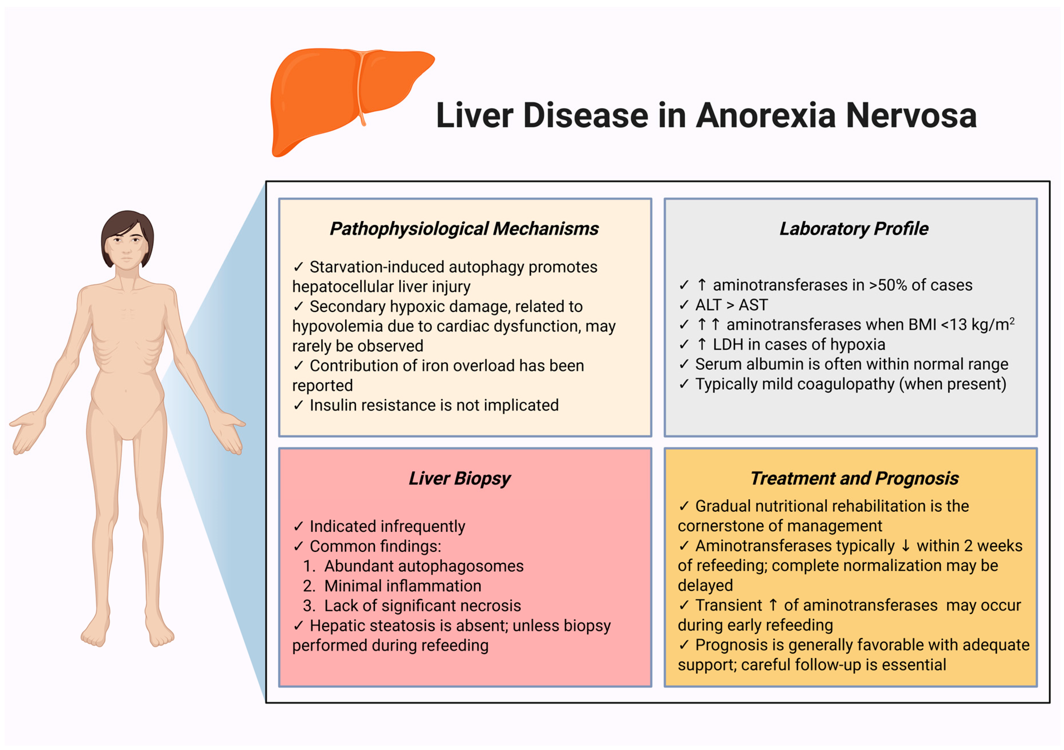 - Cuntz, U.; Voderholzer, U. Liver Damage Is Related to the Degree of Being Underweight in Anorexia Nervosa and Improves Rapidly with Weight Gain. Nutrients 2022, 14, 2378. [Google Scholar] [CrossRef] [PubMed]