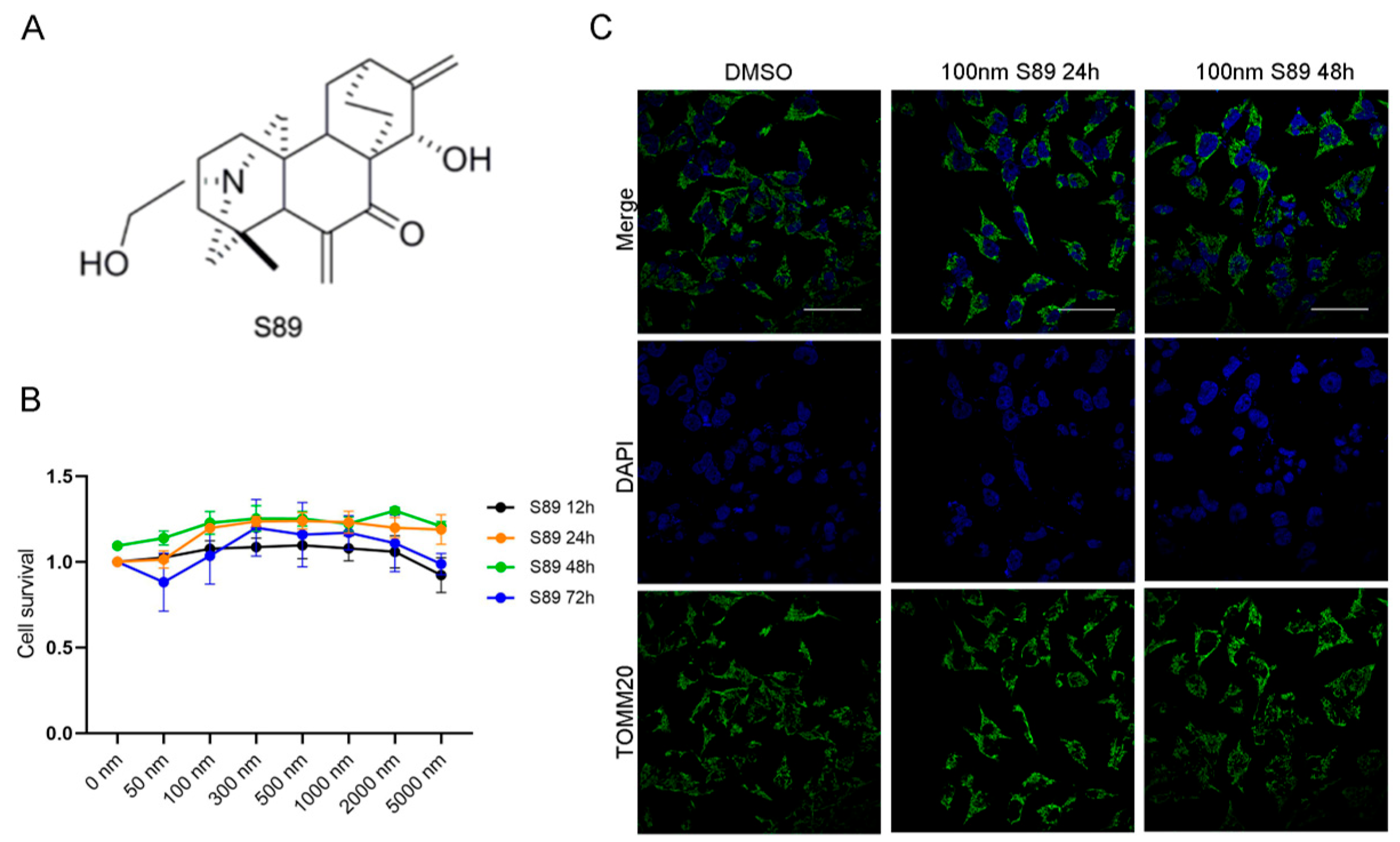 Figure 1. S89 restored cell viability in hypoxia stress-treated Min6 cells. (A) Chemical structure of S89. (B) The viability of Min6 cells treated with S89 was measured using the CCK-8 assay at different concentrations of S89. Various concentrations of S89, ranging from 50 nM to 5 μM, were added to the culture medium for specified durations before conducting the CCK-8 assay. Cell viability was normalized to that of cells not exposed to S89 at 12 h. (C) Microscopic images of mitochondria under S89 treatment. Mitochondrial morphology was assessed using immunofluorescence staining of TOMM20, as shown in green. Cells were counterstained with DAPI, as shown in blue (scale bar = 50 μm).