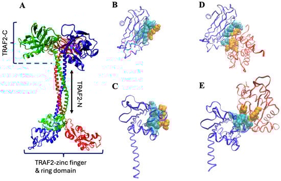 (A) Trimeric TRAF2 shape obtained through the available crystallographic models of the C-terminal, coiled coil, and zinc-finger/ring sections (pdb: 5et1, 3m0a, 3knv, respectively). (B,C) monomeric TRAF2-C (blue ribbon) interacting with the CD40 peptide ((B), top view; (C), side view; pdb file 1qsc). (D,E) Monomeric TRAF2-C interacting with TRADD N-terminal ((D), top view; (E), side view; pdb file 1fv3). The protein residues involved in the interaction are in cyan, while those of the ligand are in orange. In (D,E), the remaining structure of TRADD is reported in red.