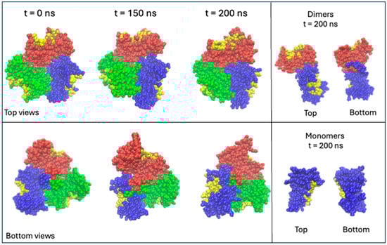 Top and bottom views of crystallographic TRAF2-C and simulated TRAF2-C at 150 and 200 ns. On the right side of the figure, the simulated dimeric and monomeric proteins at 200 ns are reported. The three chains are colored in blue (subunit A), red (subunit B), and green (subunit C). The TRADD and CD40 binding residues are reported in yellow.