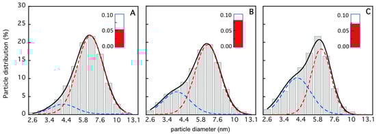 Light scattering particle distribution profile as a function of the particle for [TRAF2-C] ≈ 4 μM (A), [TRAF2-C] ≈ 0.4 μM (B), and [TRAF2-C] ≈ 0.1 μM (C). The data in each histogram have been fitted according to a double gaussian distribution (black, solid line) whose components are reported as dashed lines (blue, for monomers, and red, for trimers). In the insets (red columns), the sample dispersity values are reported (cfr. Section 2).