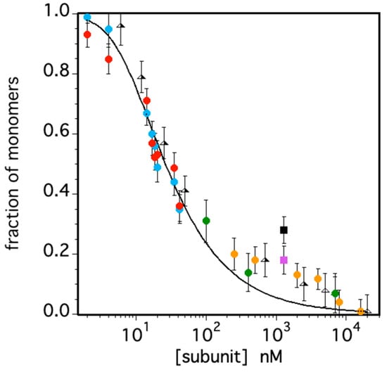 Fraction of monomeric TRAF2-C as a function of subunit concentration as estimated by FFS (cyan and red circles), light scattering (green circles), circular dichroism (yellow circles) neutron scattering (at 20 and 35 °C, pink and black squares, respectively). Previous published data are also reported as triangles. The solid line corresponds to the best fit obtained assuming a simple equilibrium between the oligomeric and monomeric protein states as described in [].