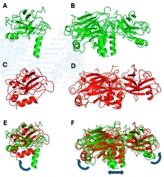 Monomeric (A,C,E) and trimeric (B,D,F) configuration of TRAF2-C in the initial (green) and final (red) frames of the MD simulation (200 and 500 ns for the monomeric and the trimeric protein, respectively). Pictures (E,F) represent the superposition of each couple of files (initial/final), the blue arrows indicating the major structural re-arrangements.