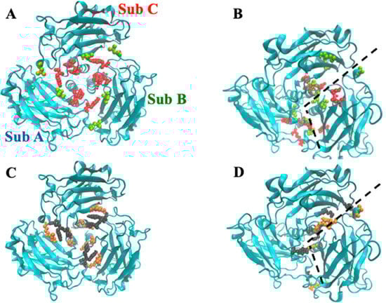Graphical rendering of TRAF2-C residues (A) characterized by a high BC (red, BC > 5000) or a medium BC (lime, 4000 < BC < 5000) in the trimeric crystal structure. In (B), the same features are reported at t = 200 ns. In (C,D), the residues involved in inter-chain crystallographic H-bonds (C) or inter-cluster H-bonds ((D), t = 200 ns) are reported (black vs. orange), as evaluated by the PISA software v1.48 []. The dashed lines in panel B and D correspond to the boundary between cluster AC and subunit B.