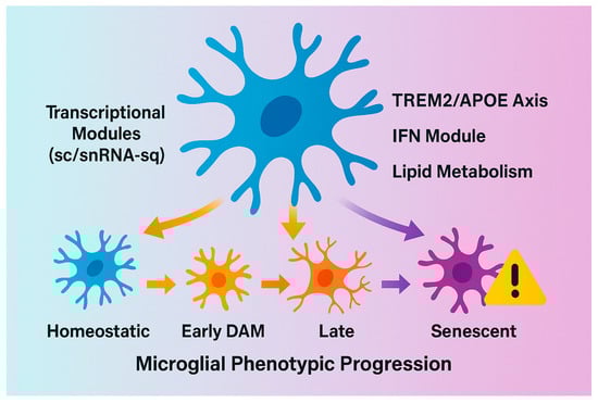 As disease progresses, however, sustained stimulation and metabolic stress drive a shift toward chronic activation and phagocytic exhaustion. Microglia accumulate lipid droplets and undegraded debris, exhibit lysosomal dysfunction and mitochondrial impairment, and secrete pro-inflammatory cytokines that perpetuate neuronal injury []. This stage is characterized by reduced receptor expression, impaired autophagy, and the emergence of “senescent” or “dystrophic” microglia incapable of effective clearance.