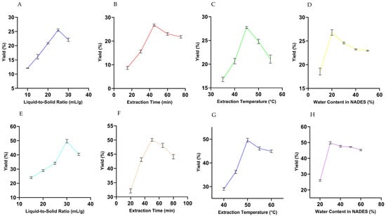 Effect of individual extraction parameters on piperine yield using UBE and UPE. Data represent the mean ± SD of three independent experiments performed in triplicate. (A,E) Liquid-to-solid ratio, (B,F) Extraction time, (C,G) Extraction temperature, and (D,H) Water content in NADES.