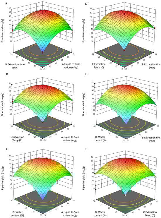 As shown in Figure 1A,E the piperine yield exhibited a clear dependence on the liquid-to-solid ratio for both UBE and UPE. In UBE, the yield increased from 12.10 mg/g to a maximum of 25.51 mg/g as the ratio rose from 10 to 25 mL/g, but further increasing to 30 mL/g led to a slight decline to 22.10 mg/g. This trend suggests that a ratio of 25 mL/g provided an optimal balance between sufficient solvent availability for solubilization and efficient mass transfer while avoiding excessive dilution that could hinder extraction efficiency []. For UPE, increasing the liquid-to-solid ratio from 15 mL/g to 30 mL/g significantly enhanced piperine yield, reaching a maximum of 49.60 mg/g, followed by a slight decrease to 40.38 mg/g at 35 mL/g. This indicates that 30 mL/g was optimal, offering efficient solubilization and diffusion without unnecessary dilution of the solvent system [].