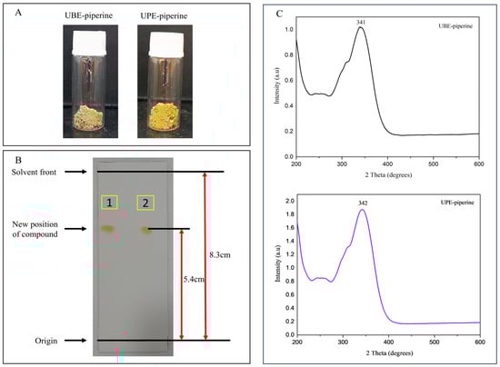 The identity and purity of piperine were confirmed by recording the characteristic UV absorbance spectrum from 200 to 600 nm using a Shimadzu UV-1800 spectrophotometer (Shimadzu, Japan). Samples from UBE and UPE were dissolved in ethanol to a suitable concentration, and their spectra were compared for the characteristic absorbance peak at 342 nm and absence of extra peaks.