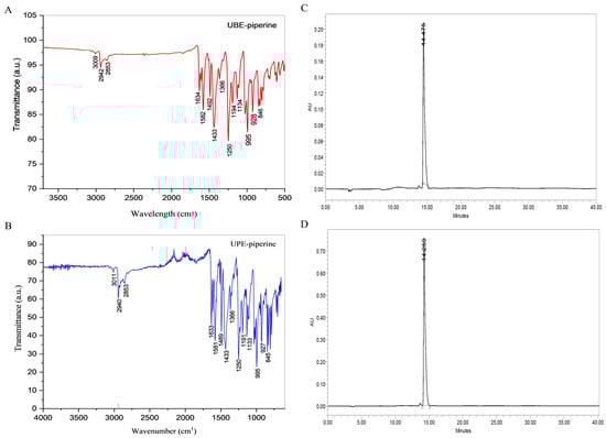 FTIR was applied to identify functional groups characteristic of piperine. Each UBE and UPE sample were prepared by directly applying the powdered material onto the PerkinElmer Spectrum Two FTIR spectrometer (PerkinElmer, Waltham, MA, USA) in ATR mode, and spectra were recorded over the range of 4000–400 cm−1 to confirm the molecular structure.