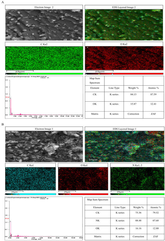 Energy-dispersive X-ray spectroscopy (EDX) was performed in conjunction with SEM using an Oxford Instruments X-Max detector (Oxford Instruments, UK) to determine the elemental composition and purity of piperine samples. Spectra were acquired at 15 kV accelerating voltage with a 60 s live time. Data were analyzed using Oxford INCA software (Version 5.05) to determine the weight (%) and atomic (%) of detected elements.