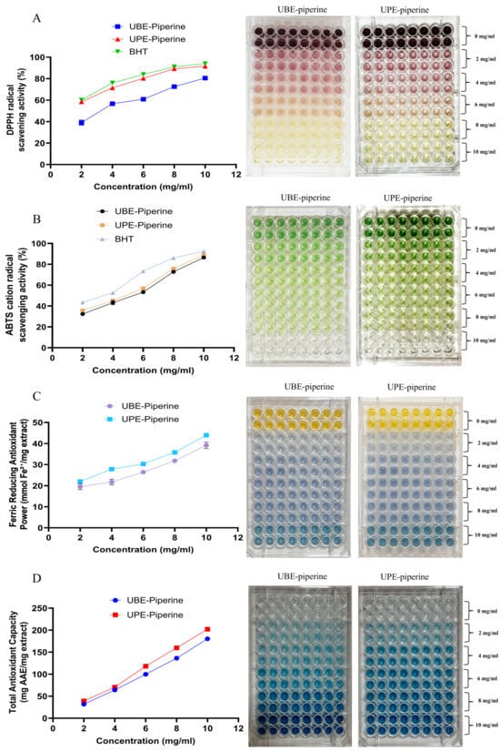 The antioxidant potential of purified piperine obtained from UBE and UPE was evaluated using DPPH, ABTS, FRAP, and TAC assays. Test samples were dissolved in ethanol, filtered through 0.22 µm syringe filters for sterilization, and prepared at concentrations of 2–10 mg/mL. All measurements were performed in triplicate to ensure reproducibility. Radical scavenging activity and overall antioxidant capacity were calculated relative to the respective reference standards. Detailed assay conditions, including reagent preparation, incubation times, and detection wavelengths, are summarized in Table 5. Percentage scavenging or antioxidant activity was determined using the following formula: